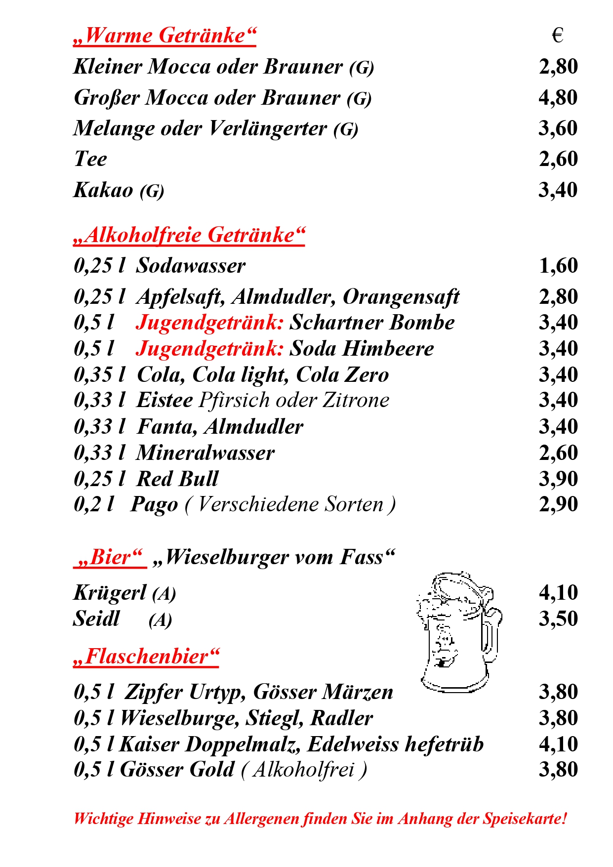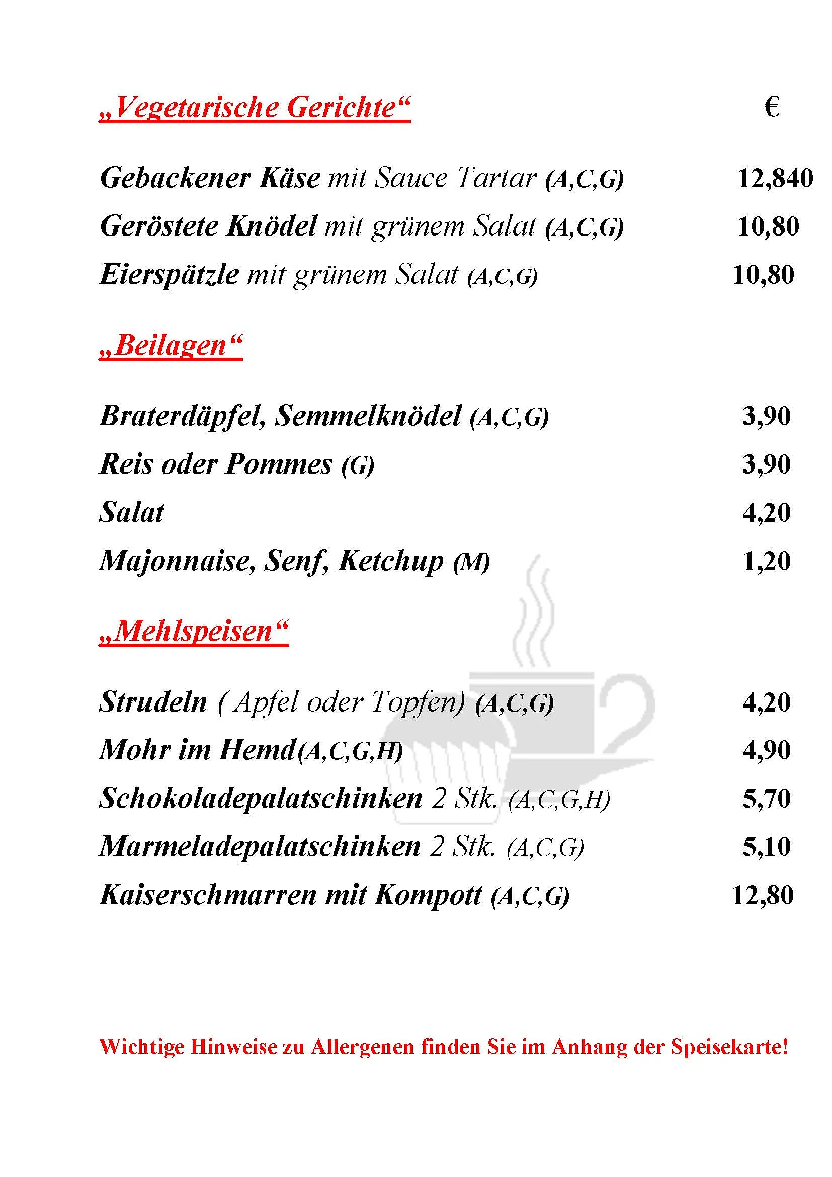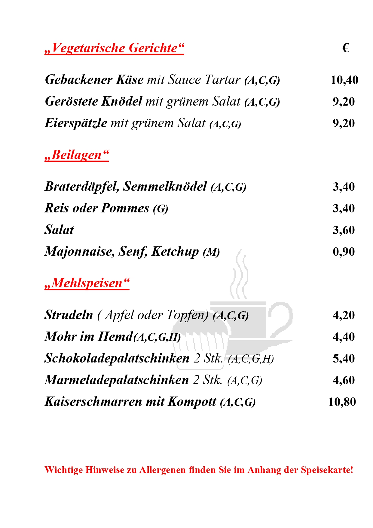 Bei allen Gerichten auf den Speisekarten sind die Allergene natürlich angeführt. Sie können im gemütlichen Restaurantbereich Platz nehmen und sich Ihr Essen schmecken lassen oder gerne auch im schattigen Gastgarten. Wir versuchen Ihre Wünsche immer zu erfüllen, denn Ihr Wohlgefühl bei uns hat Priorität. Vor dem Lokal können Sie in der Kurzparkzone parken.