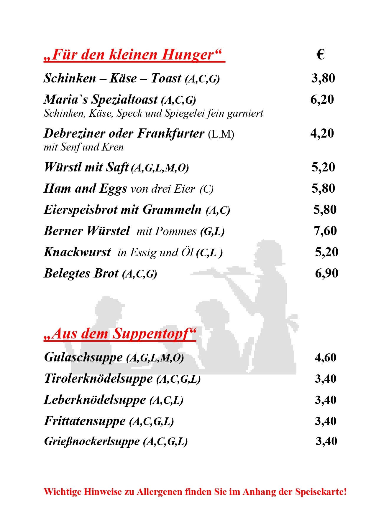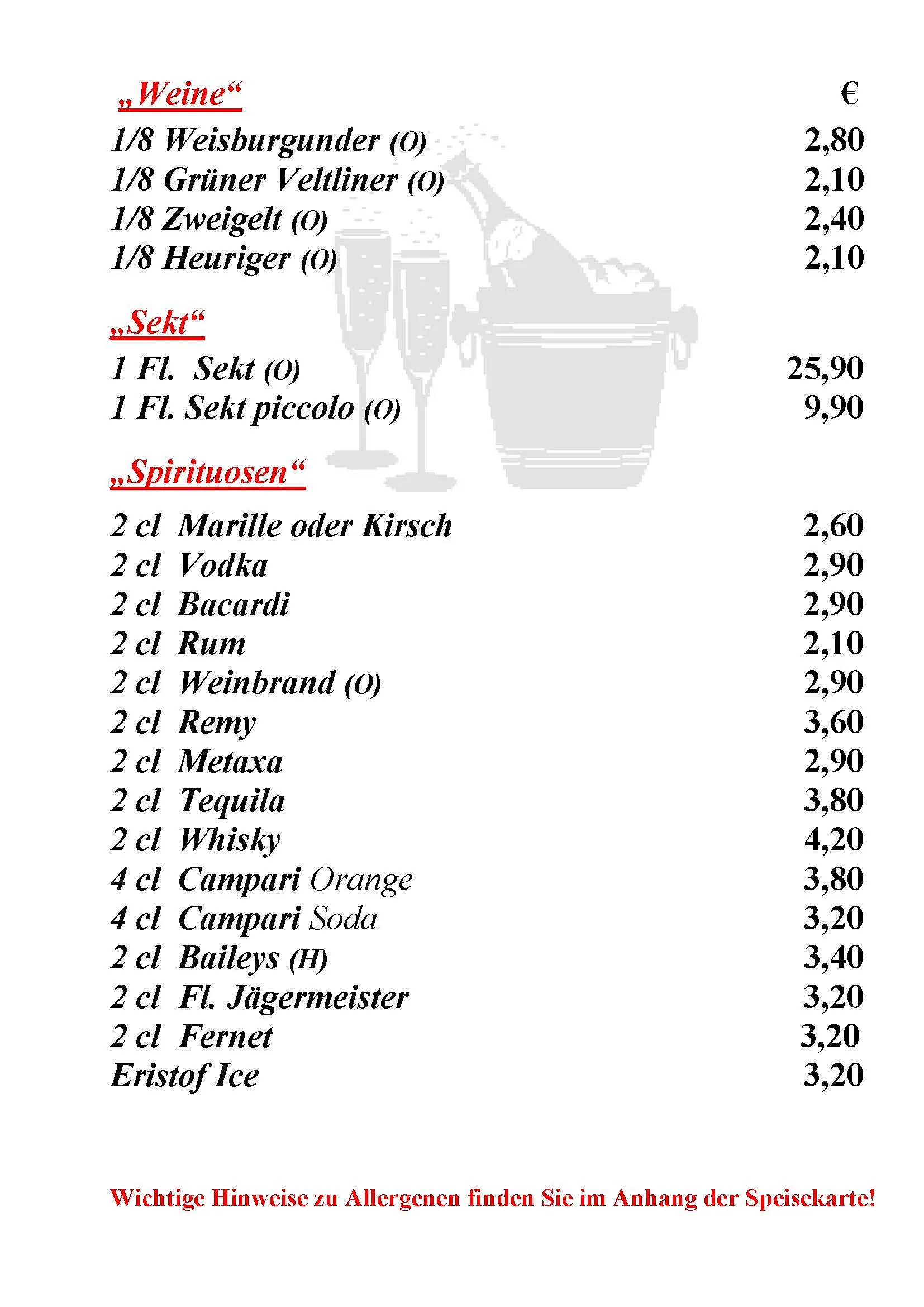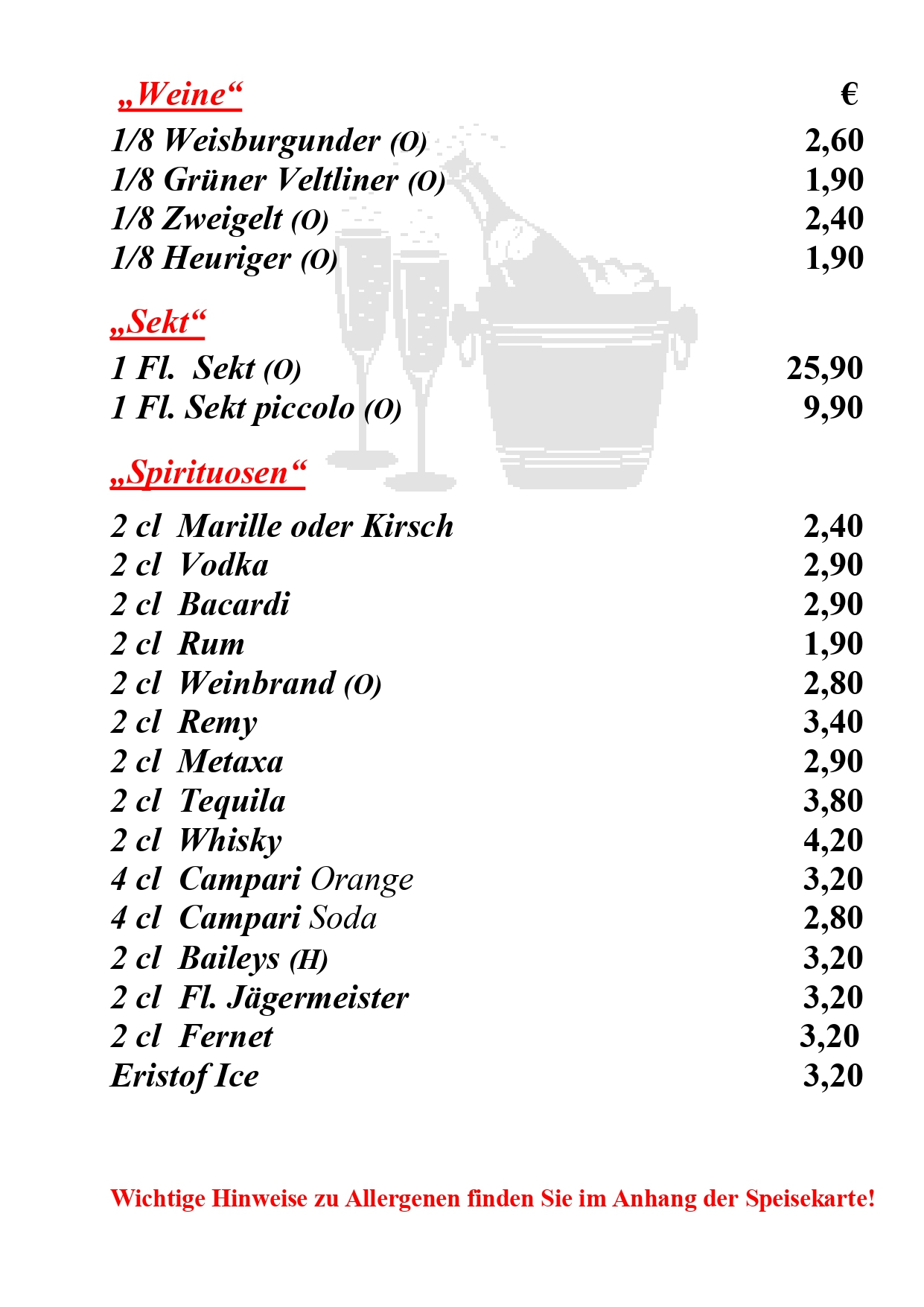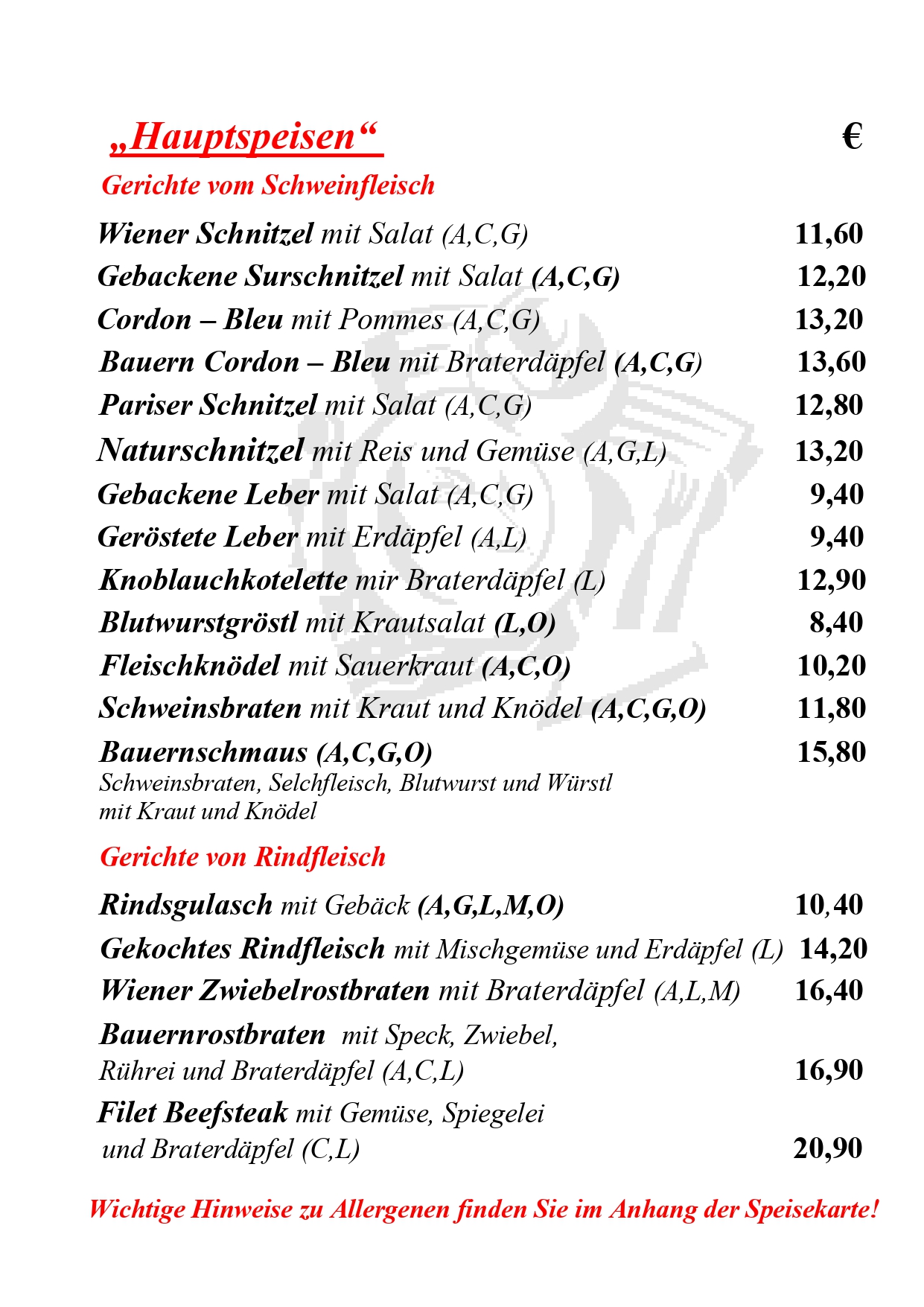 Bei allen Gerichten auf den Speisekarten sind die Allergene natürlich angeführt. Sie können im gemütlichen Restaurantbereich Platz nehmen und sich Ihr Essen schmecken lassen oder gerne auch im schattigen Gastgarten. Wir versuchen Ihre Wünsche immer zu erfüllen, denn Ihr Wohlgefühl bei uns hat Priorität. Vor dem Lokal können Sie in der Kurzparkzone parken.