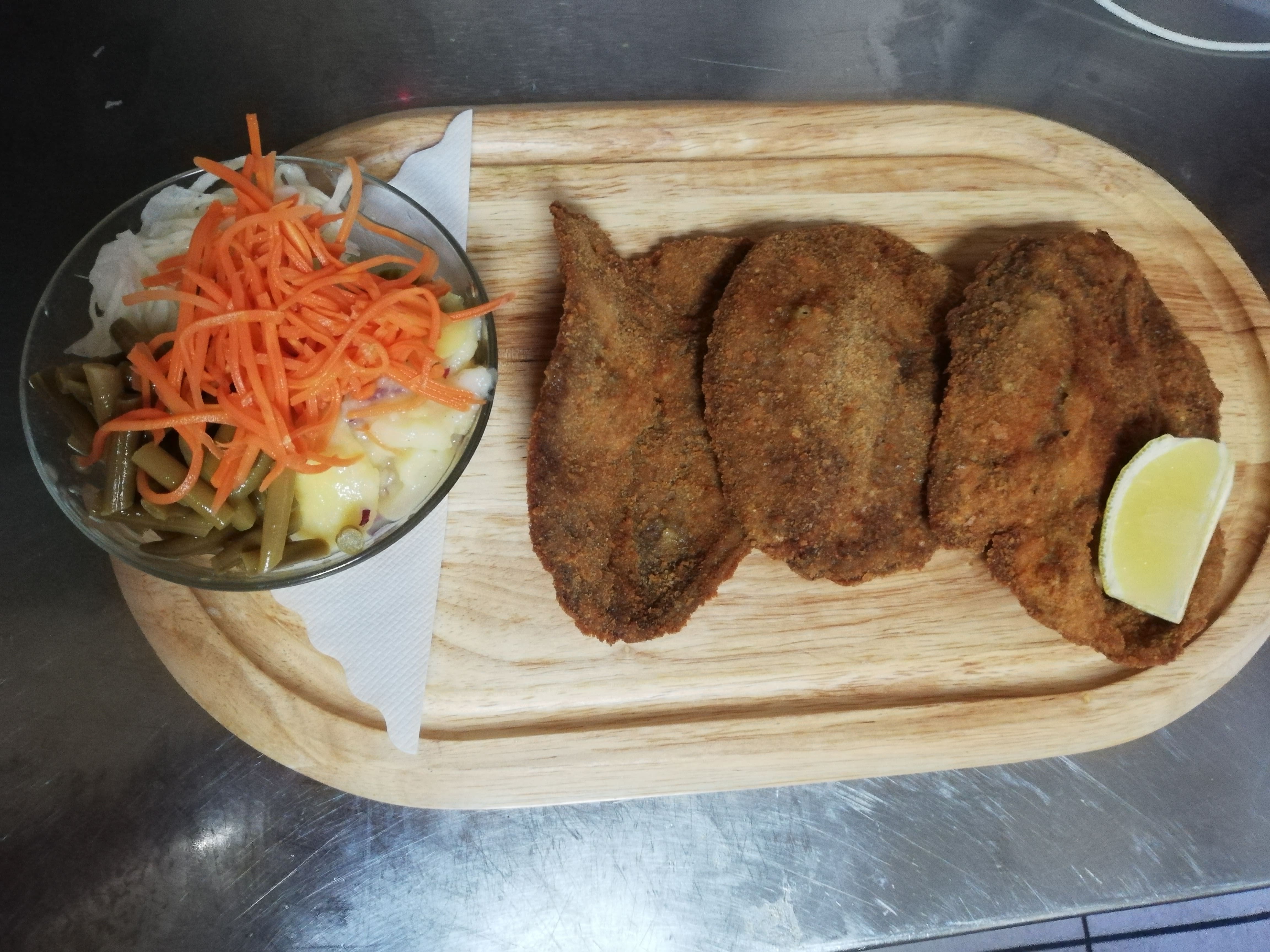 Gebackenes Schweineschnitzel mit Kartoffelsalat (A,C,G) um 8,20 Euro