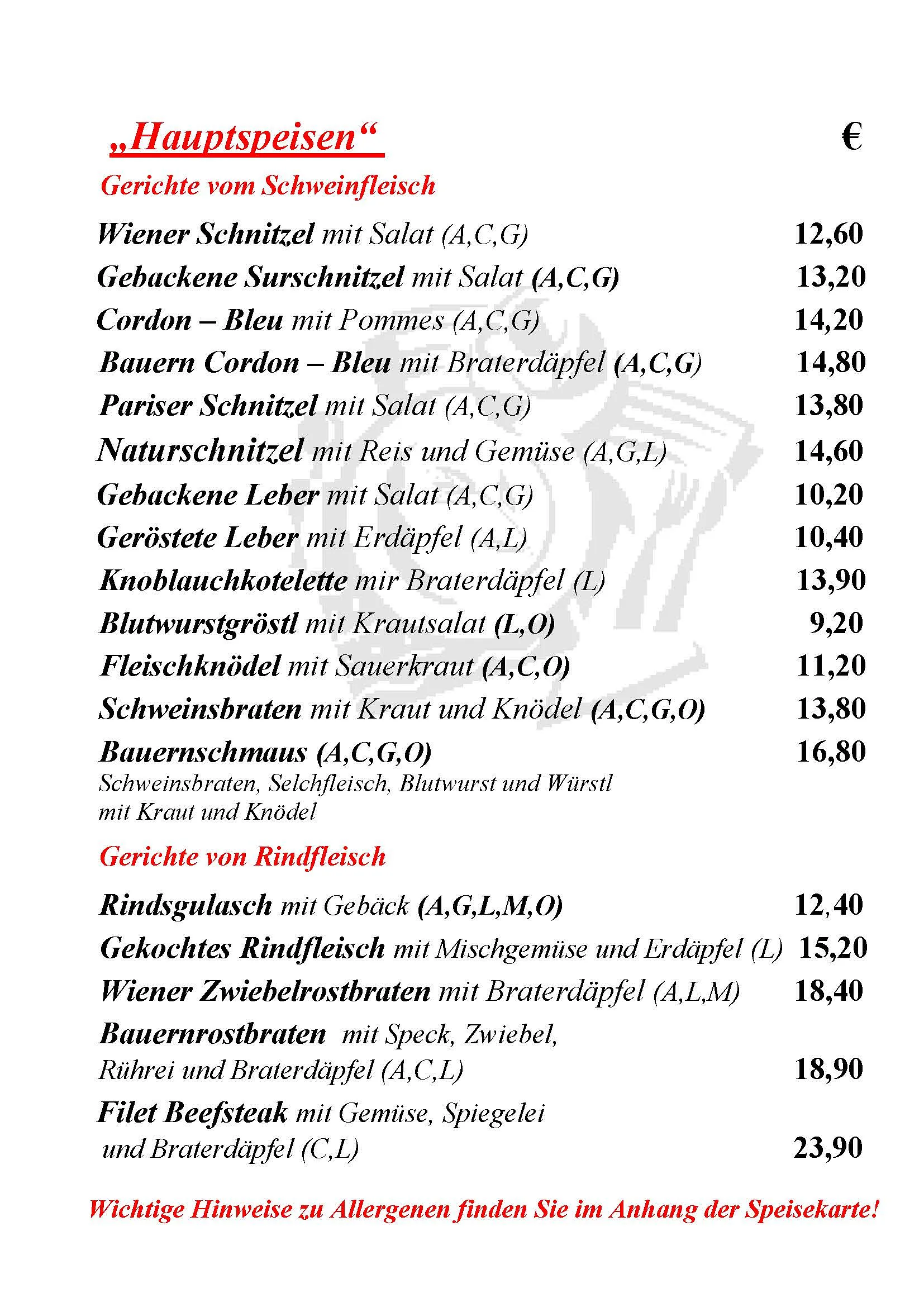 Wir haben uns auf die Traditionelle Wiener Küche und Hausmannskost spezialisiert und servieren Ihnen herrliche Spezialitäten für jeden Geschmack: Werktags ein 3-gängiges Menü mit Suppe (Vorspeise) und Dessert oder Spezialitäten während unserer saisonalen Themenwochen wie beispielsweise Eierschwammerln, Wild, Spargel und noch vieles mehr. Specials: Alle 14 Tage bieten wir Ihnen rund 10 verschiedene Gerichte im günstigen Angebot. Das reichhaltige Sortiment an österreichischen Qualitätsweinen kann sich sehen lassen.
